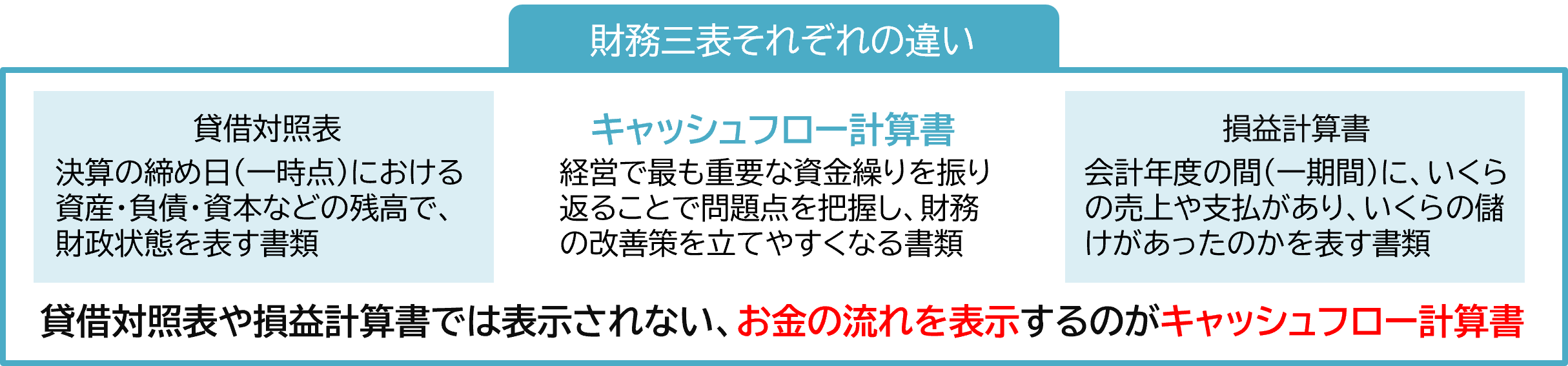 キャッシュフロー計算書と貸借対照表や損益計算書との違いは、以下になります。