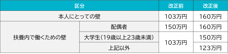 これにより、税制改正後の「年収の壁」は下表のように変わります。
