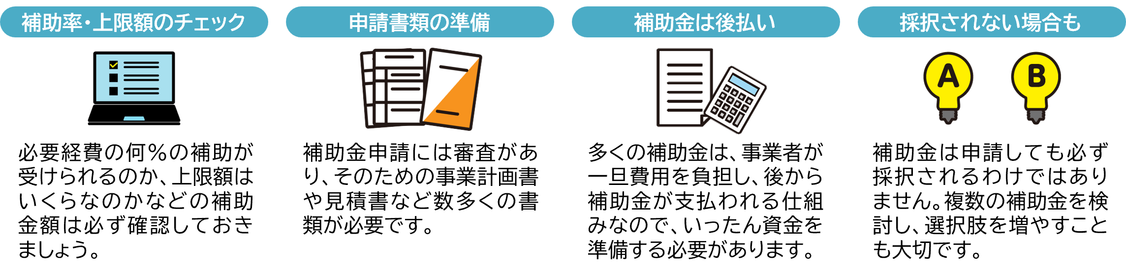 補助金活用に関して、共通して以下のようなポイントがあります。