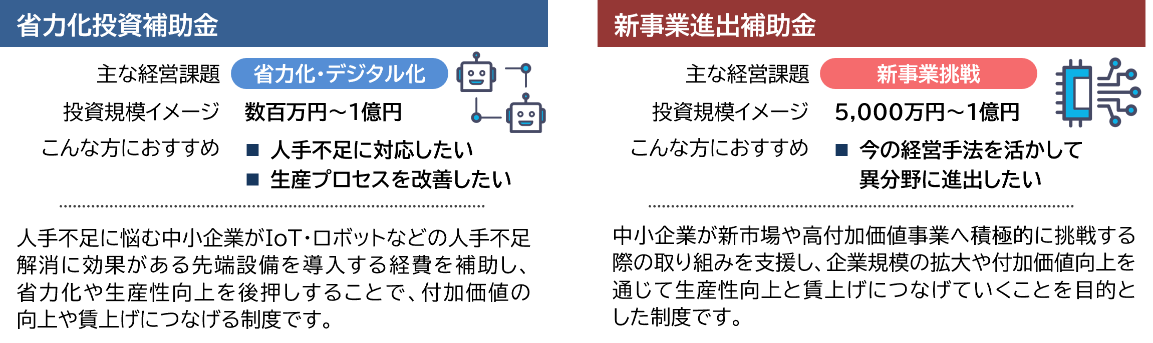 現在も中小企業省力化投資補助金やものづくり補助金、大規模成長投資補助金など様々な補助金公募が行われており、今後も様々な補助金が予定されています。