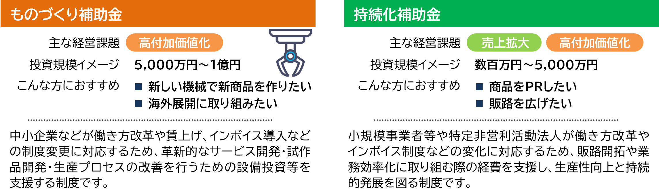 現時点において実施している4大補助金は、「ものづくり補助金」「持続化補助金」「省力化投資補助金」「新事業進出補助金」になります。