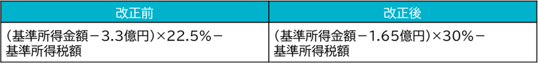 今回の改正では、対象者が大幅に拡大するうえ、税負担も増加します。具体的には、特別控除額が3.3億円→1.65億円へと半減し、適用税率も22.5%→30%へと引き上げられます。